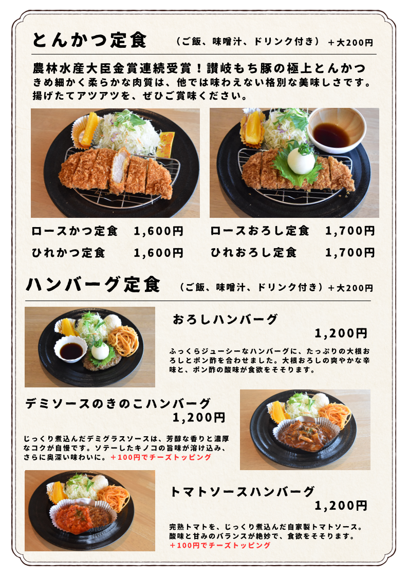 農林水産大臣金賞連続受賞!讃岐もち豚の極上とんかつ きめ細かく柔らかな肉質は、他では味わえない格別な美味しさです。 揚げたてアツアツを、ぜひご賞味ください。 ご飯、味噌汁、ドリンク付き