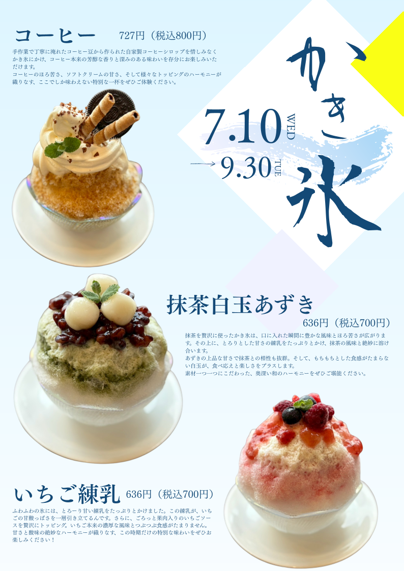 手作業で丁寧に淹れたコーヒー豆から作られた自家製コーヒーシロップを惜しみなくかき氷にかけ、コーヒー本来の芳醇な香りと深みのある味わいを存分にお楽しみいただけます。コーヒーのほろ苦さ、ソフトクリームの甘さ、そして様々なトッピングのハーモニーが織りなす、ここでしか味わえない特別な一杯をぜひご体験ください。